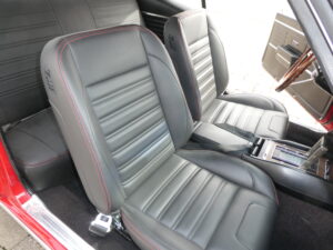 The restored interior features custom leather low-back bucket seats with matching rear seating, a center console with classic horseshoe shifter, custom steering wheel, and a full custom Bluetooth stereo system with a professionally mounted speaker setup.