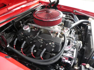 The high-performance big-block build includes forged pistons, a competition camshaft, Comp Cams lifters and pushrods, a new timing chain and gears with Cloyes timing cover, and a custom 7-quart oil pan from Milodon paired with a high-volume oil pump from Melling. Fuel delivery comes from 66-lb injectors, braided fuel lines, and an electric fuel pump, while ignition is handled by an HP Smart Coil ignition system.
