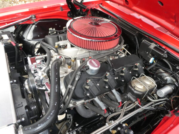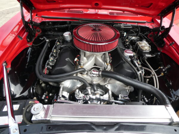 Cooling is provided by a custom aluminum four-row radiator from Holley Frostbite, while additional highlights include custom black big-block valve covers, polished engine components, a custom 2-inch cowl hood, and an Optima Batteries battery.