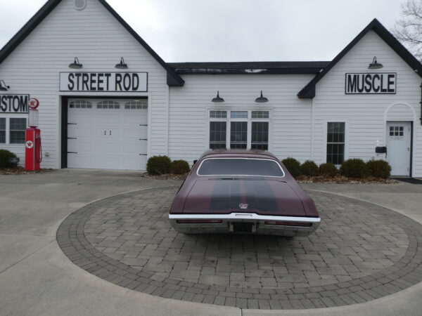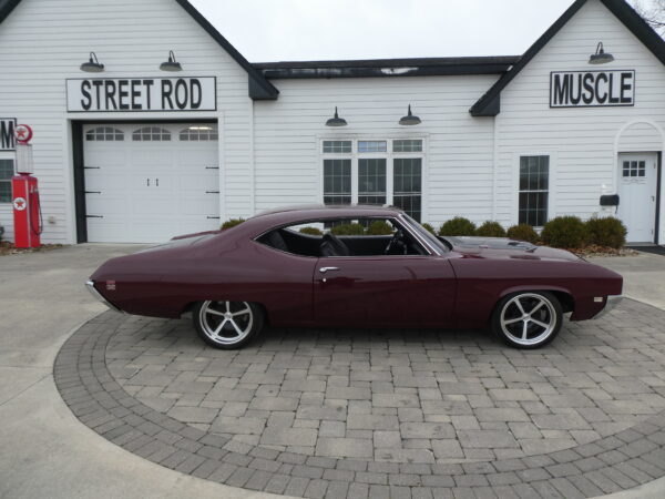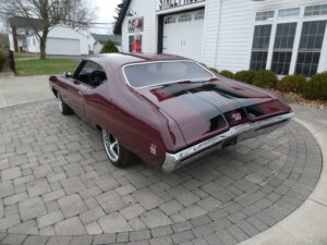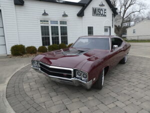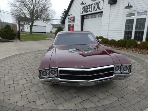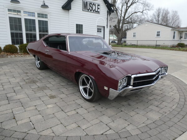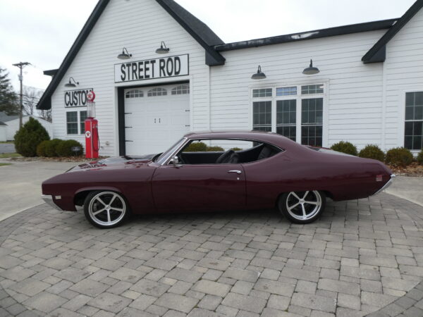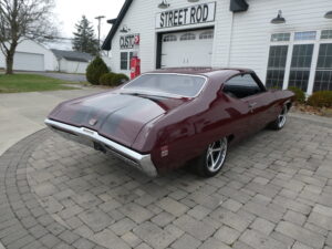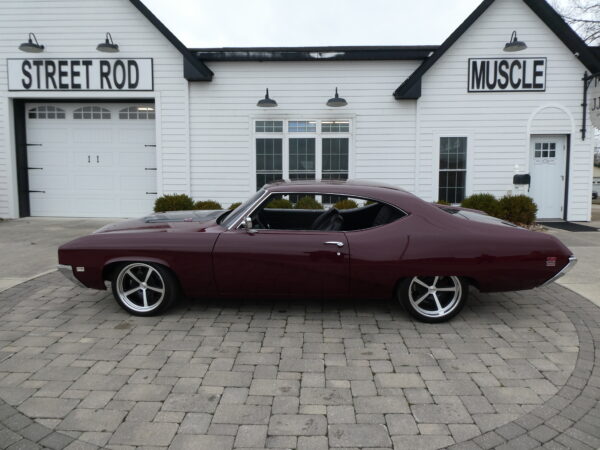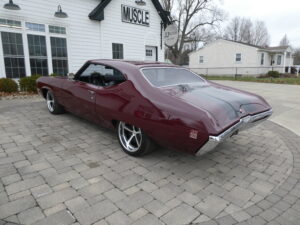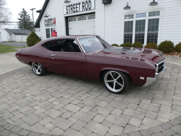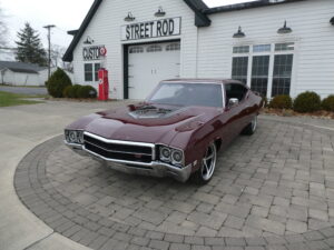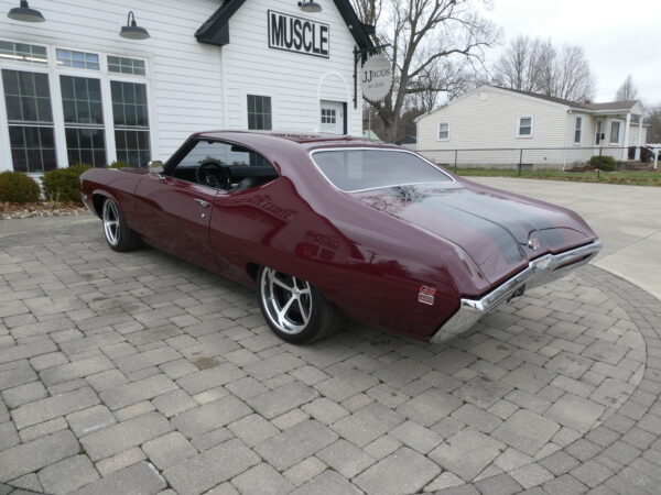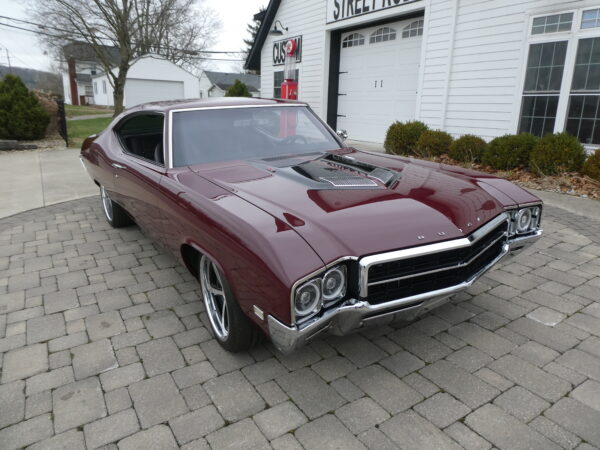 The body has been tastefully customized, including shaved drip rails and a custom Buick-style air intake integrated into the LS powerplant. The exterior is finished in OEM Buick Burgundy Poly Mist, accented by subtle black Rally stripes that highlight the car’s classic muscle heritage.